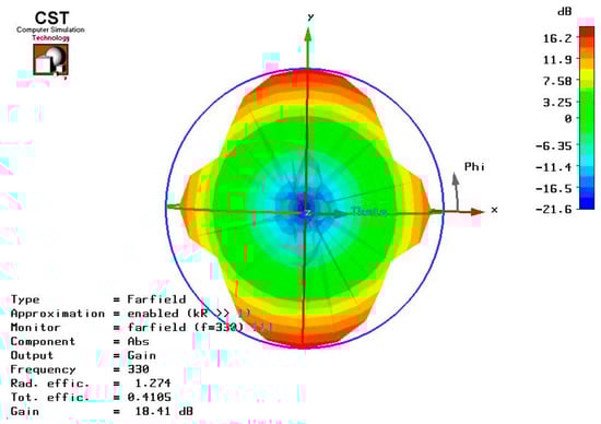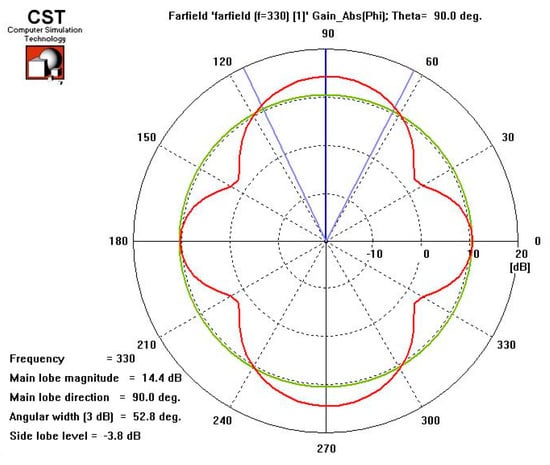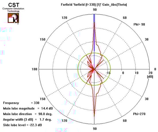 Slot antennas are very popular microwave antennas, and slotted waveguides are used for high frequency radar systems [1,2,3,4,5,6,7,8,9,10,11,12,13,14,15,16]. A thin slot in an infinite ground plane is the complement to a dipole in free space. This was described by H.G. Booker [2], who extended Babinet’s principle from optics to show that the slot will have the same radiation pattern as a dipole such that the E and H fields are swapped. As a result, the polarization is rotated, so that radiation from the vertical slot is polarized horizontally. For instance, a vertical slot has the same pattern as a horizontal dipole with the same dimensions, and we are able to calculate the radiation pattern of a dipole. Thus, a longitudinal slot in the broad wall of a waveguide radiates just like a dipole perpendicular to the slot. By using this principle, it is easier to analyze slot antennas using the theory of dipole antennas. The slots are typically thin and 0.5 wavelengths long. The position of the slots affects the intensity of the transmitted power by directly causing the impedance matching of the antenna; good impedance matching produces the maximum efficiency of power transmission. In [15], a waveguide-fed transverse slot was analyzed using the Method of Moments (MoM) formulation, wherein the internal admittance matrix elements were evaluated from image theory and using the images of the slot from waveguide walls. The contribution from all the images not in the same row as the slot was evaluated using a closed-form expression and a rapidly converging series with negligible contribution. The contribution from the row containing the reference slot was evaluated by adding the mutual admittance between a few images and the reference slot using some recently developed simple and accurate approximations. The formulation was extended to transverse slots radiating between the baffles. The results calculated using this simple, efficient, and intuitive method were in excellent agreement with other theoretical as well as measured results. The technique can be extended to other slot configurations, such as an inclined slot, and for other slot aperture distributions in configurations permitting image formation, such as with an edge condition. Despite the fact that we do not consider images, our results are satisfactory in that the simulation results show that the antenna gain is 18.4 dBi and the azimuth beam width is , compared to 21.8 dBi and in the analytical design. It may be that adding images may reduce the discrepancy further; however, this is beyond the scope of the current work.