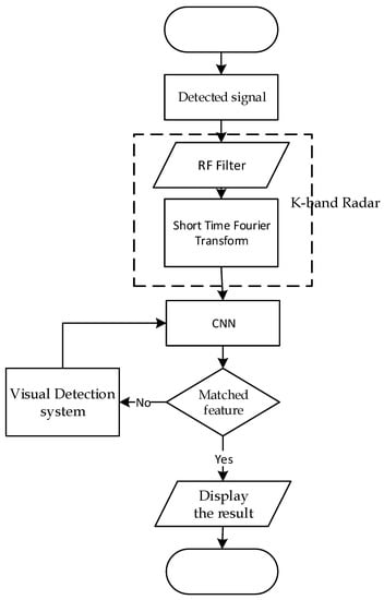 The system supports two different detection methods, as shown in Figure 1. The first detection uses the 3D K-band radar, in which the signal is received from the radar antenna [26], then is added to the CNNs to analyze the simulated radar signals reflected off the drones using the short-time Fourier transform (STFT) spectrograms [27]. The drones differ in numerous respects, including blade length and rotation rates, which affect the STFT spectrograms.