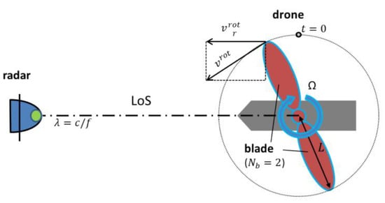 Since the micro-Doppler phenomenon provides information about the target’s moving parts, its implementation for precise feature extraction is essential for the target’s correct detection and categorization. After reducing noise, the mixer’s output extracts the Doppler and micro-Doppler components. The feature extraction from the radar data accommodates the time dependency because micro-Doppler is time dependent. The radar wavelength λ and the relative or radial blade tip speed are what determine the micro-Doppler shift for [36], a single propeller with a rotating axis parallel to the LoS is shown in Equation (2) and Figure 2.