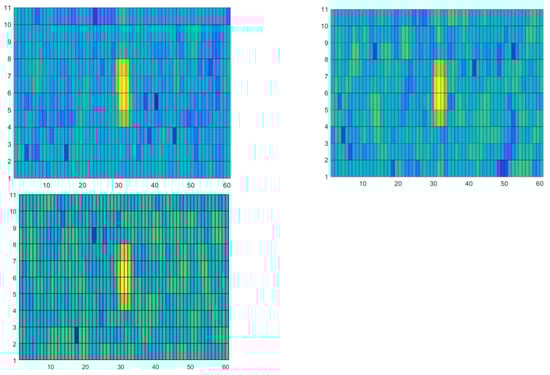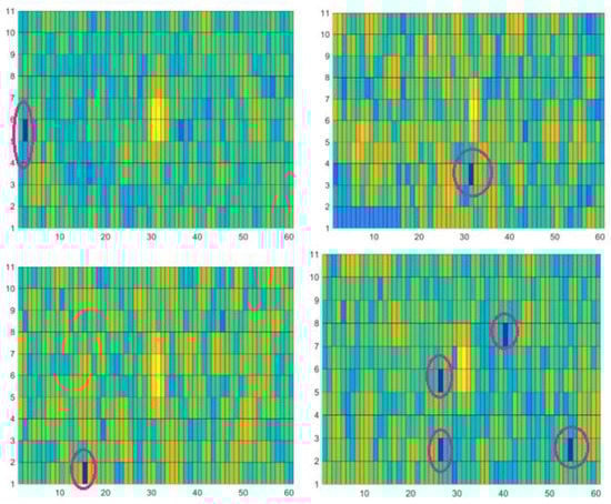 Noise presents a radar distance restriction; the SNR and noise ratio are necessary for the radar images and affect the probability of detecting the wrong target. Four measurements were captured under various noise backgrounds for our system, i.e., dust storms, clouds, noise from surrounding objects, and external sources. In addition, we noticed that the far reflector produced little signal strength that could not exceed the noise floor, leading to wrong target detections. These effects are captured in Figure 10, with four radar images with noise backgrounds.