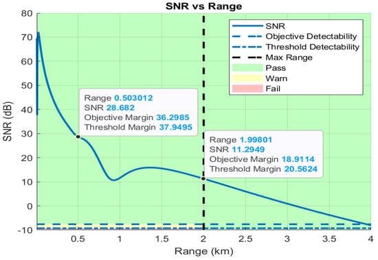 The target detectability range was examined from 10 to 2000 m, and the P.F.A. of radar, considering the environmental situation, the SNR at 2 km range reached 11.2949 dB, which exceeds that in [24]. Therefore, the detectability of the target is calculated, as shown in Figure 7.