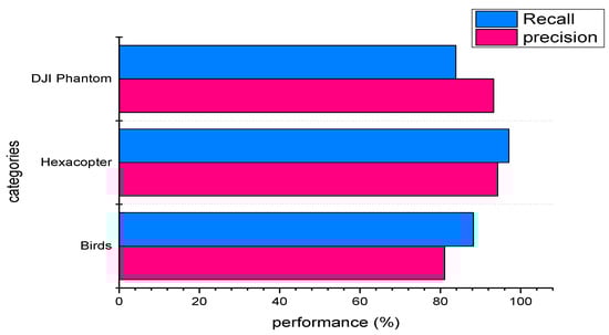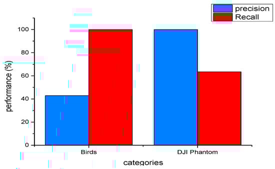 In Figure 11, precision means that among the inputs whose class is predicted to be positive, precision is calculated separately for each class. This study defines precision in each of the phantom, hexacopter, and bird classes. For instance, the precision of the phantom class means that all the inputs are projected as multirotor. In contrast, recall means sensitivity, which is calculated separately for each class. For example, the recall in the phantom class means that among all the phantom entries, what percentage are correctly detected and recognized as phantom? Another example is if the precision for birds is 63%, this percentage means 63% of the birds in the dataset were recognized as a bird correctly, which also indicates the ability of the system to minimize false positive detections with 63%. While if the precision of birds’ detection is 100%, it means the bird class was identified correctly among the other three classes, which highlights the system’s ability to identify birds’ presence without any false positive detections.