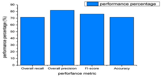 The system consists of one camera (SIGMA-2000M-1012) with a resolution of 1920 × 1080 pixels (full H.D.) [28]. CNN (ResNet-50) applies to the detected photo to extract features and compare them with the existing dataset to determine the target type. The results of the drone detection and recognition system using visual imaging show a high level of accuracy, with an overall accuracy of 89.12%. The precision results indicate that the system can accurately identify the drones, with a precision of 93.3% for the DJI Phantom drone, 94.29% for the hexacopter, and 81.08% for birds, as shown in Figure 11. The overall precision was 89.22%.