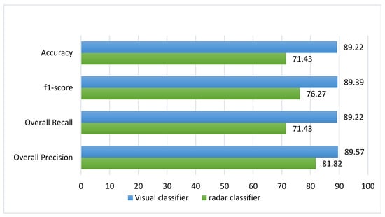 The recall results indicate that the system can identify a large proportion of the actual positive cases, with a recall of 83.35% for the DJI Phantom drone, 97.06% for the hexacopter, and 88.24% for birds. The overall recall was 89.22%. The F1 score, which balances the precision and recall, was 89.24%. This indicates that the system has a good balance between detecting positive cases and avoiding false positive detections [29]. Moreover, the radar classification network showed a significant decrement in accuracy, recall, precision, and F1 score, which were 71.43%, 71.43%, 81.82%, and 76.27%, respectively.