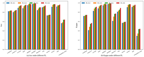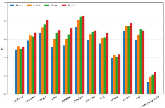 Figure 6 shows the change of the metric PS under different PLs. The value of PS fluctuates greatly on each dataset, and this result is also proved by the numeric results in Table 4. The p-value of the Friedman test on PS is 1.38 × 10−6. smaller than the given significant level of 0.05. Therefore, there exists a significant difference in PS under different values of PL. Similar to the performance of Acc and Kappa under different PLs, the value of PS is also positively correlated with PL. The unlabeled instances selection of the ISTri algorithm mainly depends on the agreement on the pseudo-labels offered by the classifiers on the labeled instance subsets, where the parameter PL controls the number of labeled instances. The classification ability of multi-view classifiers trained on the labeled instance subsets increasingly improves as the enlarging value of PL so that the likelihood that predictive labels for each unlabeled instance are the same could increase obviously. In this way, the final selection of unlabeled data increases significantly.