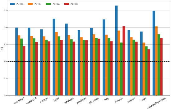 The change in speedup ratio (SR) under different PLs is shown in Figure 7, where the baseline SR = 1 is also plotted on it. It can be found that all the value of SR on each dataset under different values of PL is larger than one. The metric SR has significantly different values on each dataset under different PLs, and it can be validated by the result of Table 6. The p-value of the Friedman test on SR is 3.73 × 10−7, smaller than the given significant level of 0.05. Therefore, there exists a significant difference in SR under different values of PL. Meanwhile, SR is negatively correlated with PL on each dataset from Figure 7. SR evaluates the ratio of the execution time between the ISTri algorithm and the Tri algorithm, and the main difference between them is the number of unlabeled instances that are used to learn the classifier. The selected number of unlabeled instances continues to increase with the increasing value of PL for the ISTri algorithm, and it also induces its execution time to get longer. This result explains the reason that SR is negatively correlated with PL.