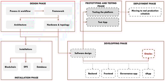 The descriptions of business processes, workflows, the general concept of the framework, and the architecture of the platform are defined for the design phase. The installation phase includes the blockchain, the distributed file system networks, and the database deployment. The development phase includes the preparation of all software solutions, including blockchain oracles, frontend and backend, and the test application that will later run as a dApp (decentralized application). The prototyping and testing phase is designed to check the functionality of the platform and various experiments. The last phase is planned for the implementation of the platform in real operation. All elements in the diagram that are marked with dashed lines are under development or testing.