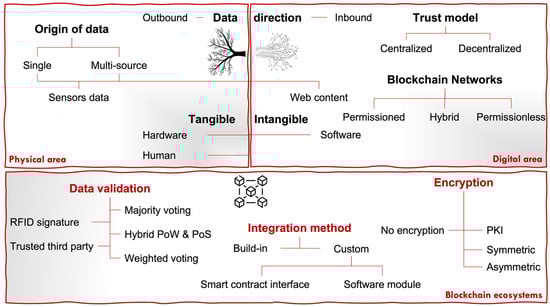 Data validation, encryption methods, and integration methods refer entirely to blockchain ecosystem areas. Data validation (RFID signature, majority voting, weighted voting, hybrid PoW and PoS, or trusted third party) depends on whether the data provided by the external system is true, comes from the original source, and has not been altered. The most common approach is to rely on trusted data providers when oracles do not use any data validation method. Such a strategy is applicable if the data source is reliable.