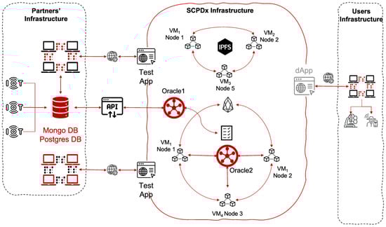The partners’ infrastructure is not a single and coherent one; however, any member who requested access can use the data exchange services through a test application (Test App) and public/private keys access. At a later stage, the functionality of the Test App will be transferred to a dApp. The users’ infrastructures are considered external for the platform.
