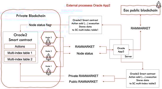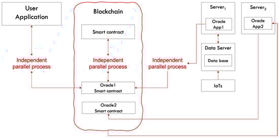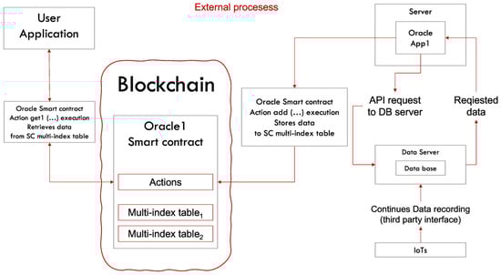 All communication and data exchange between oracle app1, oracle app2, the oracles’ smart contracts, and the user application are parallel and independent. The oracles’ smart contracts contain multi-index tables for storing the data and performing an external (for the blockchain) and internal (for the blockchain account) request.