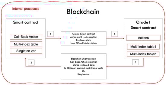Figure 7 describes a communication scheme of a user’s blockchain account, a smart contract (blockchain smart contract), and an oracle account (oracle1); i.e., oracle1 smart contract internal interactions. The user account with a smart contract can be any account that contains a call-back action according to the oracle smart contract technical specifications and with the necessary permissions granted.