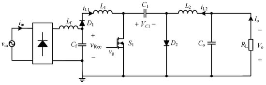 The increasing popularity and widespread use of various power electronic devices in power grids has resulted in more and more serious harmonic pollution, so power factor correction (PFC) converters have become particularly essential in the AC–DC conversion [1,2,3,4,5]. Among the commonly used PFC converters, the Boost PFC converter has the advantages of high power factor (PF) and small total harmonic distortion (THD) [2,3,4,5]. However, the Boost converter can only operate when the output voltage is higher than the input voltage, so it is hard to be used in the applications requiring low output voltage. The Buck PFC converter can meet the low output voltage requirement, but the significant harmonic distortion occurs in the input current because of the dead time when the transient rectified input voltage is smaller than output voltage [5,6,7]. Buck-Boost PFC can achieve the wider output voltage range, yet its input current ripple is large which increases the difficulty in designing the input LC filter, and the twice line frequency output voltage ripple is big [8,9].