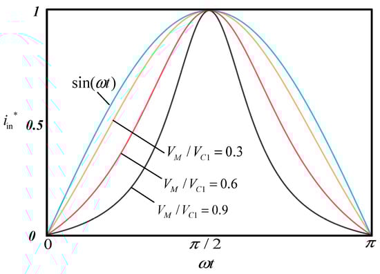 It is known from Equation (7) that there is a time component in the denominator of the converter input current iin(t), so the input current waveform of the conventional Cuk PFC converter will be distorted. For the sake of the convenience in analyzing the distortion of the input current waveform, the input current shown as Equation (7) is normalized with the base of VMton2/2TSL1(1 − VM/VC1), and the normalized input current i* waveform is illustrated in Figure 3. It can be found that the input current is related to the ratio of VM/VC1 for the conventional Cuk PFC converter. The larger the ratio of VM/VC1 is, the more serious the distortion of the input current is, and as the ratio of VM/VC1 gradually decreases, the input current distortion is reduced and gradually tends to be sinusoidal. In other words, the higher the voltage of the intermediate capacitor is, the closer the input current is to a sinewave.