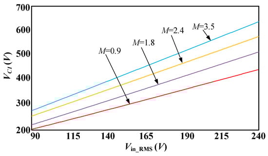 where M = L2/L1. According to the circuit parameters listed in Table 1, the relationship curves of the intermediate capacitor voltage VC1 and RMS input voltage Vin_RMS with different ratios M are shown in Figure 4. From Figure 4, it can be observed that the intermediate capacitor voltage VC1 increases as the Vin_RMS increases when M remains unchanged, and the intermediate capacitor voltage VC1 increases as the ratio M increases at a certain input voltage Vin_RMS.