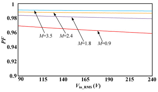 According to (14) and (15), the relation curves of the PF of the conventional Cuk PFC and RMS input voltage Vin_RMS with different ratios M are shown in Figure 5. Observing Figure 5, the PF decreases slightly as the Vin_RMS increases in the range from 90 V to 240 V when M is a constant value, and the PF decreases as the ratio M decreases when the converter input voltage Vin_RMS is a fixed value.