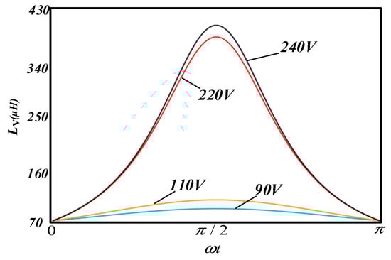 According to the circuit parameters listed in Table 1, the initial value of the variable inductor Linitial is 75 µH, and from Equation (20) and combined with the relation of the intermediate capacitor voltage VC1 and the input voltage Vin_RMS, the range of inductor variation can be plotted in a half line cycle as shown in Figure 8.