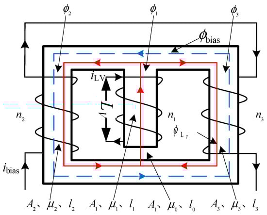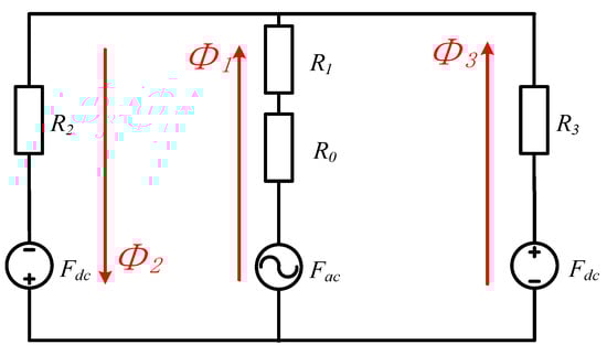 As shown in Figure 10, Fac is the AC magnetomotive force; Fdc is the DC magnetomotive force generated by the bias current; Φ1, Φ2, and Φ3 are the fluxes of the middle, left, and right windings, respectively; R1, R2, and R3 are the reluctances of the middle, left, and right magnetic circuits; and R0 is the middle leg air gap reluctance, according to Ohm’s law of the magnetic circuit which can be expressed as