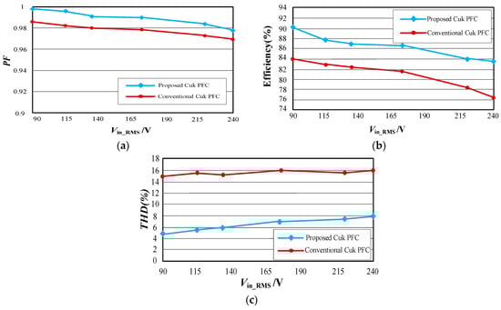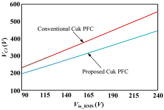 From Figure 11, it is obvious that the proposed converter has a significant reduction in the intermediate capacitor voltage VC1 during the variation of input voltage Vin_RMS from 90 V to 240 V compared with the traditional Cuk PFC converter.