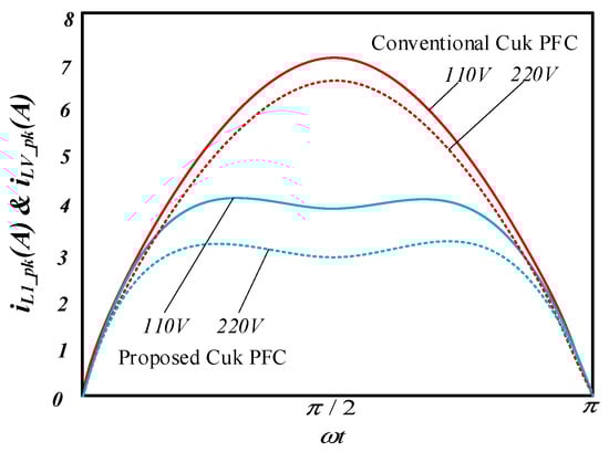According to Equation (1), the peak current iL1_pk(t) flowing through the input inductor L1 of the conventional Cuk PFC converter during one switching cycle can be expressed as