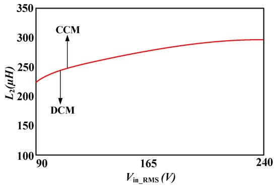 According to (31) and combined with the analysis of the intermediate capacitor voltage VC1, the critical inductor value of the output inductor L2 operating in DCM when the input voltage Vin_RMS is 90 V~240 V can be obtained as shown in Figure 13.