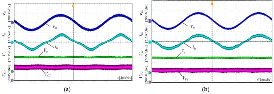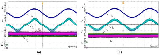 The experimental results of input current iin, input voltage vin, output voltage Vo, and intermediate capacitor voltage VC1 for the traditional Cuk PFC converter and the proposed Cuk PFC converter with variable inductor when the input voltage is 110 Vac and 220 Vac are illustrated, respectively, in Figure 17 and Figure 18. According to Figure 17a and Figure 18a, it can be observed that the conventional Cuk PFC converter can obtain a stable output voltage at 72 V. Harmonic distortion occurs in the input current, and the voltage of the intermediate capacitor reaches 280 V and 520 V when the input voltage is 110 Vac and 220 Vac, respectively. According to Figure 17b and Figure 18b, it can be noticed that the proposed Cuk PFC converter can obtain a stable output voltage at 72 V without obvious twice line frequency output voltage ripple; the waveform of input current is corrected to sine-wave with variable inductor; and the intermediate capacitor voltage is reduced to 240 V and 410 V when the input voltage is 110 Vac and 220 Vac, respectively. Therefore, compared with the conventional Cuk PFC converter, the input current of the proposed Cuk PFC converter based on variable inductor can obtain near-ideal sine-wave input current, and the intermediate capacitor voltage of the proposed converter is significantly reduced.