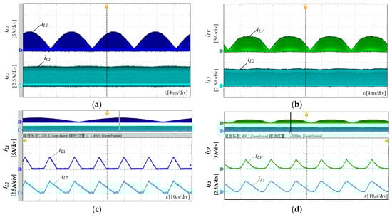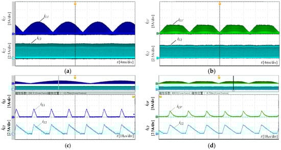 Experimental waveforms of iL1, iL2, and iLV when RMS input voltage is 220 V. (a) Conventional Cuk PFC converter; (b) Proposed Cuk PFC converter; (c) Zoomed in waveform of (a) at ωt = π/2; (d) Zoomed in waveform of (b) at ωt = π/2.