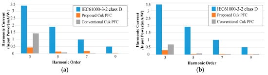 The comparison data of the input current harmonic content test results of both the traditional and proposed converters are presented in Figure 21. The experimental data of PF, efficiency, and THD are illustrated in Figure 22. From Figure 21 and Figure 22c, compared with the traditional Cuk PFC converter, the proposed converter is easier to meet the requirement of IEC61000-3-2 class D. The THD and third harmonic current are significantly reduced by using the variable inductor. From Figure 22a, the PF of the proposed converter with variable inductor is enhanced over the input voltage variation range. Due to the application of the variable inductor, the PF is increased from 0.982 to 0.995 at 110 Vac, and the PF is enhanced from 0.975 to 0.981 at 220 Vac. Because of the influence of the variable inductor main current on the inductor saturation level, the actual inductor value does not reach the theoretical calculated value, which makes the PF of experimental test results with variable inductor lower than the theoretical analysis result. From Figure 22b, the efficiency is improved obviously by using the variable inductor, and the efficiency can be higher than 90% at 90 Vac input voltage.