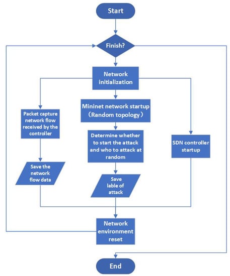Due to the lack of detailed datasets for RLFA in SDN networks, we developed a script to automatically generate the required training dataset in a simulated environment. The process flowchart of the generation process is shown in Figure 5. This script was developed using Python and runs on a virtual machine of Ubuntu. The network is simulated using Mininet, the SDN controller is implemented using the Ryu controller, and network flow capture is performed using the pypcap package.The automatic generation script consists of three parallel modules: the controller module, the network flow collection module, and the network activity module. The controller module is responsible for automatically starting and resetting the controller. The network flow collection module listens in on the corresponding port of the controller and captures the network flows received by the controller during the attack process. The captured network flows in this study contain 256 complete data packets received by the controller and their corresponding timestamps.