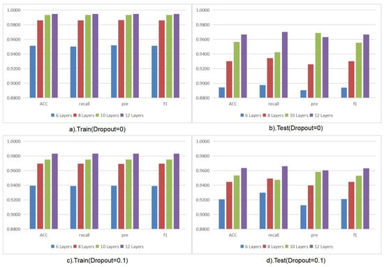 After completing the training, we analyzed the accuracy, precision, F1 score, and recall. The results are shown in Figure 6. Figure 6a shows the performance of models with different numbers of layers on the training set when Dropout = 0. Figure 6b shows the performance of models with different numbers of layers on the test set when Dropout = 0. Figure 6c shows the performance of models with different numbers of layers on the training set when Dropout = 0.1. Figure 6d shows the performance of models with different numbers of layers on the test set when Dropout = 0.1.