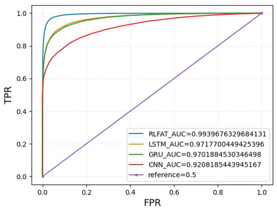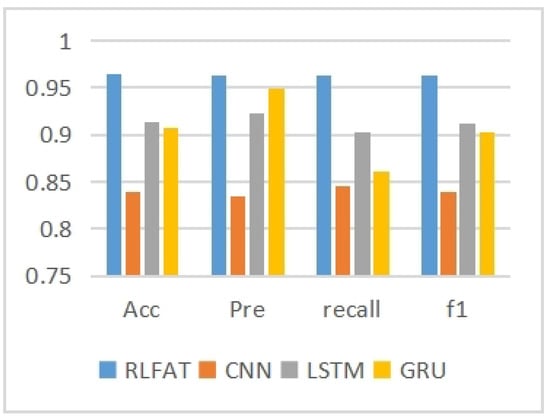 Afterwards, in order to verify the superior performance of our RLFAT model, we compared it with the classic and commonly used deep learning models CNN [], LSTM [], and GRU []. For comparison purposes, all models were trained using the same deep learning framework (pytorch), the same loss function (BCELoss), the same optimizer (AdamW), the same batch size (256), and the same learning rate (), and they were trained until the loss no longer decreased. CNN uses the classic VGG16 model [], while LSTM and GRU both use the default LSTM and GRU model of Pytorch. Their input dimensions are 256*256 (matching the dimensions of a single piece of data in the data set obtained in Section 5.2), and their output is whether there is a probability of attack. The training results and ROC curves of the models are shown in Figure 7 and Figure 8 (Acc represents Accuracy, Pre represents Precision, recall represents Recall, and f1 represents F1 score).