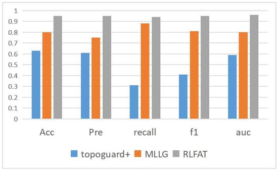 To better evaluate the effectiveness of our RLFAT model, we compared our proposed method with other existing traditional solutions to better evaluate its effectiveness. We chose the classic TopoGuard+ [] model and the MLLG model proposed in the literature [], which uses delay attacks to impact RLFA detection. We collected the corresponding datasets required by each model in our simulation environment and tested their detection effects on RLFA, comparing them with our model. The results are shown in Figure 9 (Acc represents Accuracy, Pre represents Precision, recall represents Recall, f1 represents F1 score, and auc represents AUC).