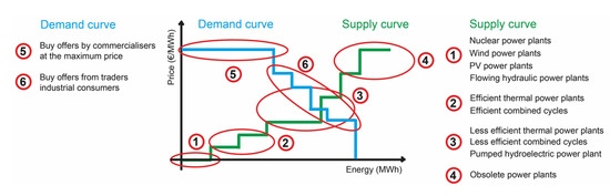 The mechanism of operation of the day-ahead market is as follows: (i) On day , at 12:00, selling agents submit the electricity bid for each hour of day D. (ii) On day , at 12:00, buying agents submit the purchase offer for each hour of day D. (iii) On day , builds the supply and demand curves according to the criteria shown in Figure 2.