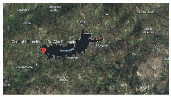 The Alto Rabagão pumped hydroelectric storage power plant is located in the district of Vila Real in Northern Portugal (latitude 414416″ N, longitude 75114″ W, and altitude of 880 (m)) [28]. The project is led by the Portuguese energy company . The upper reservoir of the Alto Rabagão has already been built. The surface area is 2200 (ha), and it has a volume of 569 (hm3), and a maximum water level of 185 (m) [28]. The River Rabagão feeds this reservoir. In order to guarantee the environmental flow of the lower part of the river, the power plant always discharges a part of the flow without generating electricity. In this case, the reserved volume is 11 (hm3). Figure 3 shows a Google Earth image of the Alto Rabagão pumped hydroelectric storage power plant.