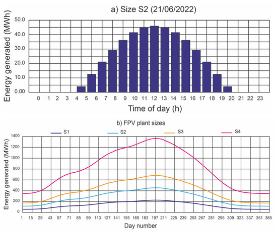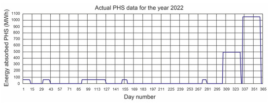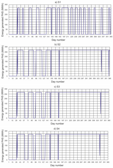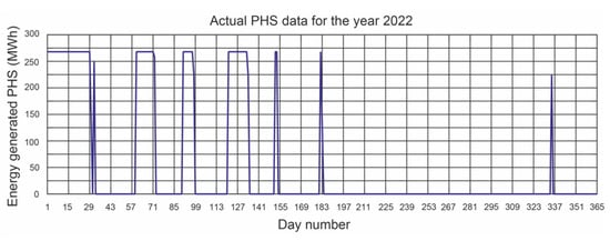 Taking into account the volume of water available, the Alto Rabagão pumped-storage hydroelectric power station operates at full power for 4 h a day [28]. Therefore, the energy generated each day is 268 (MWh).