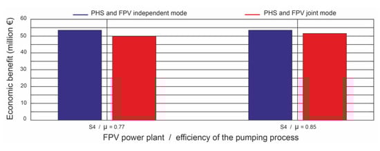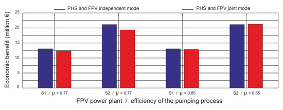 The intermittent nature of the solar resource together with the fluctuating energy demand of the day-ahead electricity market requires the use of efficient long-term energy storage systems. The pumped hydroelectric storage () power plant has demonstrated its technical and commercial viability as a large-scale energy storage technology. The objective of this paper is to analyse the parameters that influence the mode of operation in conjunction with a floating photovoltaic () power plant under day-ahead electricity market conditions. This work proposes the analysis of two parameters: the size of the power plant and the total process efficiency of the power plant. Five plant sizes are analysed: (), (), (), () and () of the plant. The values of the total process efficiency parameter analysed are as follows: for old plants, and for more modern plants. The number of daily operating hours of the plant is 4 h. These 4 h of operation correspond to the highest prices on the electricity market. The framework of the study is the Iberian electricity market and the Alto Rabagão dam (Portugal). Different operating scenarios are considered to identify the optimal size of the power plant. Based on the measured data on climatic conditions, an algorithm is designed to estimate the energy production for different sizes of plants. If the total process efficiency is , the joint operation of both plants with plant sizes and yields a slightly higher economic benefit than the independent mode of operation. If the total process efficiency is , there is always a higher economic benefit in the independent operation mode, irrespective of the size of the plant. However, the uncertainty of the solar resource estimation can lead to a higher economic benefit in the joint operation mode. Increasing the number of operating hours of the plant above 4 h per day decreases the economic benefit of the joint operation mode, regardless of the total process efficiency parameter and the size of the plant. As the number of operating hours increases, the economic benefit decreases. The results obtained reveal that the coupling of floating photovoltaic systems with pumped hydroelectric storage power plants is a cost-effective and reliable alternative to provide sustainable energy supply security under electricity market conditions. In summary, the purpose of this work is to facilitate decision making on the mode of operation of both power plants under electricity market conditions. The case studies allow to find the optimal answer to the following practical questions: What size does the power plant have to be in order for both plants to be better adapted to the electricity market? What is the appropriate mode of operation of both plants? What is the economic benefit of changing the turbine pump of the power plant? Finally, how does the installation of the power plant affect the water volume of the upper reservoir of the plant? Knowledge of these questions will facilitate the design of power plants and the joint operation of both plants.