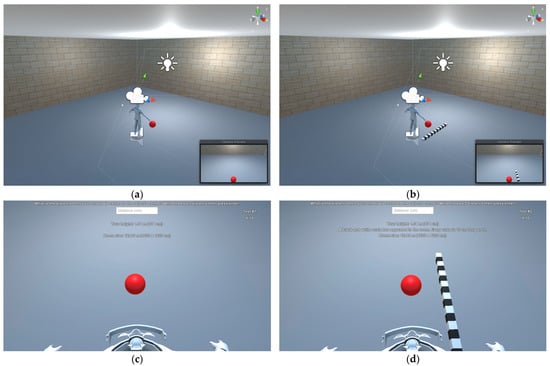 Different perspectives of two tests: (a) a round without a scale as seen in the Unity editor; (b) a round with a scale as seen in the Unity editor; (c) a round without a scale as seen from the perspective of participants; and (d) a round with a scale as seen from the perspective of participants.