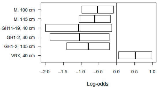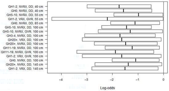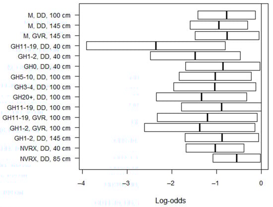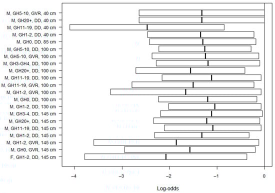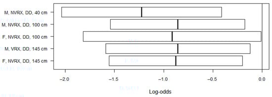 where denotes odds ratio, and denotes log-odds. The former is used to express the relative change of an event in the case of two different conditions. The latter is the logarithm of the odds ratio, which provides a better range of values. Consequently, the greater the odds, the greater the log-odds, and vice versa. Logistic regression analysis was conducted separately at each investigated distance. The basis variables for these analyses were chosen automatically by R.