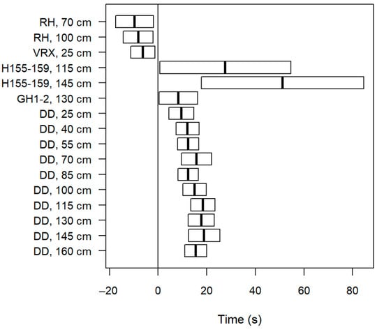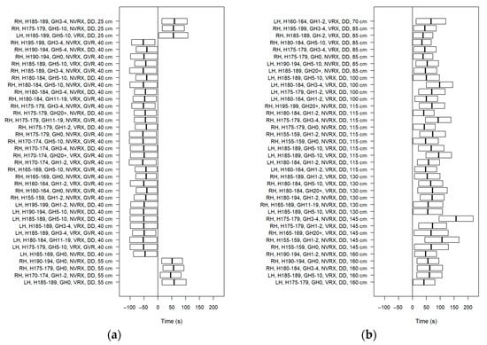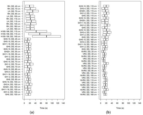 It can be observed in Figure 7 that right-handed students were significantly faster at two distances (70 cm and 100 cm), and those who had previous VR experience were significantly faster when estimating distances at 25 cm. All others were significantly slower. However, it can be quickly noticed that the desktop display had a significant effect on time. Those who estimated distances with it were significantly slower compared with those who used Gear VR.