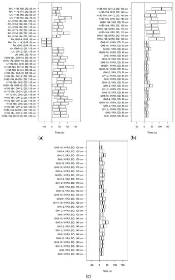 The 95% CIs of each investigated significant triplet of factors regarding the effects on distance estimation time. They are graphically split into (a–c) for better readability.