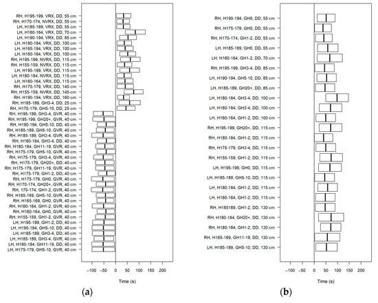 The 95% CIs of each investigated significant quintet of factors regarding the effects on distance estimation time. They are graphically split into (a,b) for better readability.