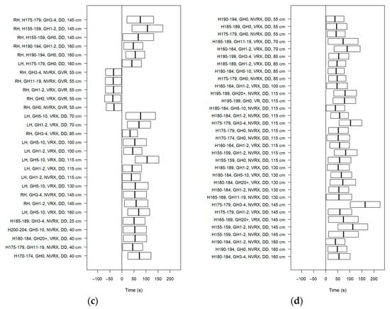 The 95% CIs of each investigated significant quartet of factors regarding the effects on distance estimation time. They are graphically split into (a–d) for better readability.