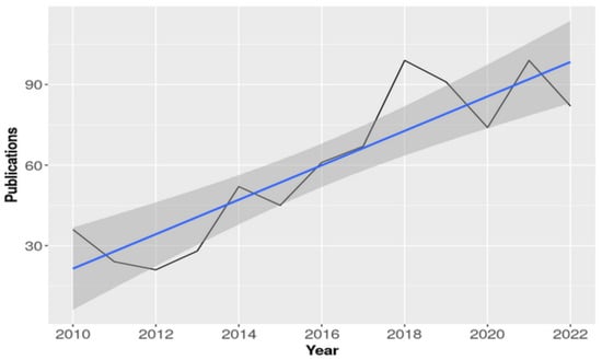 Figure 2. Number of publications per year with a linear trend (blue line) and its confidence interval.