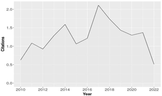 Each of the collected documents was cited by an average of 7.254 other publications, with an average rate of 1.045 per year. Thus, in response to RQ1-2, it takes an average of 11.483 months to receive the first citation. The year with the most citations per publication on average was 2014, with a mean of 14.31 citations per publication. However, the year in which publications were most cited per citable year (i.e., following years captured in the analysis) was 2017, with an average of 1.81 citations per publication and citable year. Figure 3 shows the average citations of a document per citable year for each year of publication. For example, a publication of 2010 (i.e., with 13 citable years) has 0.624 citations on average per year (the lowest of this dataset if we exclude the last year, whose information may not be complete).