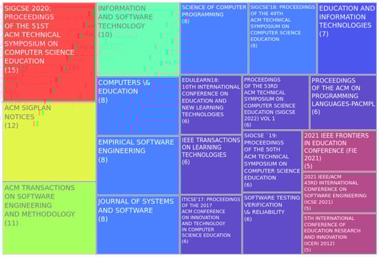 The set of 779 selected publications consists of 7 review papers, 222 journal articles, 545 proceedings papers, and 5 classified as other editorial material. These come from 455 different sources, including journals and books, among others. The top 20 publication sources (RQ1-3), presented in the tree map of Figure 4, account for almost one-fifth of the total publications. The Proceedings of the 51st ACM Technical Symposium on Computer Science Education is the source with the highest number of articles collected (15), followed by ACM Special Interest Group on Programming Languages (SIGPLAN) Notices with 12 publications, ACM Transactions on Software Engineering and Methodology with 11 publications, and Information and Software Technology with 10. Computers & Education, Empirical Software Engineering, Journal of Systems and Software, Science of Computer Programming, and the Proceedings of the 49th ACM Technical Symposium on Computer Science Education, with 8 publications each, complete the top 5 sources.