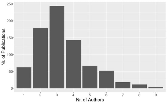 The set of publications selected for analysis contains documents from 2120 distinct authors, of which 56 authored at least 1 of the 62 single-authored documents that are part of this set. The average number of authors per document is 3.26, whereas, excluding the 62 single-authored publications, there are 3.47 co-authors per document on average. From these co-authorships, we can identify that 20.28% are international co-authorships. Figure 5 shows a histogram of the number of authors per publication that responds to RQ2-1. The most common are publications with 2 to 4 authors (72.5% of all publications), where 3-author publications are the ones in the majority.