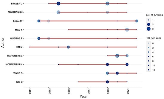 With respect to the “most prolific authors” (i.e., the authors who have made more publications) as asked in RQ2-2, Figure 6 shows the top 10, sorted in descending order from top to bottom, of authors who have made more contributions to the field and, for those, the number of publications and citations per year. From this perspective, the authors who are more active recently, such as Fraser G. and Edwards S. H., and those who were more active at the beginning of the timespan, such as Kim M., Queirós R., and Leal J. P., are easier to identify. Nevertheless, the most impactful works are those of Monperrus M., who studies mostly automated program repair techniques. The work of Fraser G., which concentrates on software testing techniques, and Kim D., which investigates techniques for the automated generation of feedback, complete the podium regarding authors’ impact. This can be confirmed by measuring the authors’ h-index (6, 5, and 5, respectively).