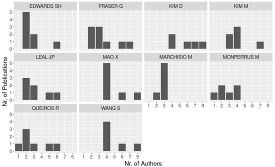 Having the most prolific authors, we constructed a histogram of the number of authors per publication for each of them separately to answer RQ2-3. Figure 7 illustrates the result. Among the most prolific authors, the only authors who have worked alone are Queiros R. (1) and Monperrus M. (1), whereas all others have no single-authored publications. Nevertheless, Edwards S. H. and Marchisio M. publish mostly in small groups with one or two co-authors. Interestingly, Mao X., Wang S., and Kim D. have only worked in large groups of four or more authors.