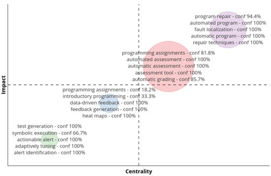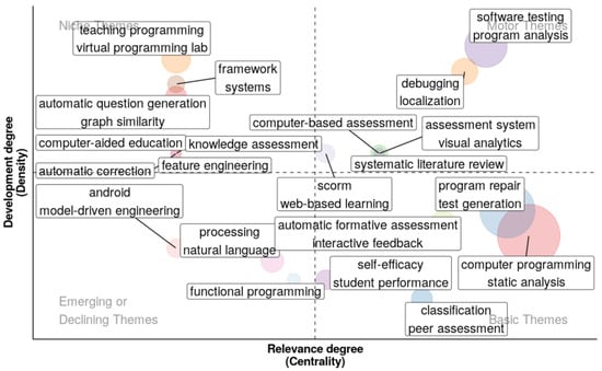 Information about current issues, trends, and methods in the field can be derived from keywords. Keywords are mandatorily provided by authors for each publication but are also assigned automatically by the indexing database, or even extracted as n-grams from the title or abstract. Therefore, for the group of research questions RQ4, these are the properties that are the subject of analysis. For the first question of the group (RQ4-1), the answer is provided in Figure 11 through a thematic map based on the analysis of co-word networks and clustering using the authors’ keywords. This approach is similar to the proposal of Cobo et al. [32]. It identifies four types of topics (themes) based on density (i.e., degree of development) and centrality (i.e., degree of relevance), namely: emerging or declining (low centrality and low density), niche (low centrality and high density), motor (high centrality and high density), and basic (high centrality and low density) topics. In emerging or declining topics, a cluster with “Android” is worth noticing as it is an indicator of the increasing interest in the automatic assessment of mobile development assignments. Niche themes include some interesting topics, such as graph similarity, which is a technique used in automated assessment for comparing source code semantically (e.g., compare to a known solution and derive feedback), and automatic question generation, as well as other topics related to tools of the domain itself (e.g., virtual programming lab, systems, and framework). Motor themes include topics such as fault localization, debugging, program analysis, and learning analytics. Finally, among the basic themes, the clusters of static analysis—analyzing source code rather than its runtime behavior—automated program repair—a technique used to automatically correct programs, which is applied to generate feedback—and test generation are the most notable.