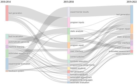 In order to answer RQ4-2 and the questions that follow, the analysis focused on 2-grams extracted from the abstract. Figure 12 divides the decade into three equal-length sections (2010–2014, 2015–2018, and 2019–2022) and shows the thematic evolution between the three sections based on an analysis of the co-word network and the clustering of the authors’ keywords [32]. From the first slice, the high interest in test generation and the evident importance of machine learning in the area already are noticeable. The second slice includes a wide range of topics with a strong relation to attempts to improve feedback, such as static analysis, automated program repair (e.g., apr techniques and program repair), and symbolic execution. Finally, in the third slice, the emphasis on topics such as static analysis, automated program repair, and test generation is maintained.