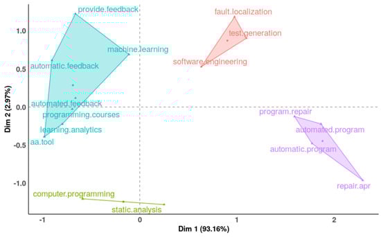 As for RQ4-3, Figure 13 presents a conceptual structure map created using multiple correspondence analysis (MCA)—a data analysis method used to measure the association between two or more qualitative variables—and the clustering of a bipartite network of the extracted terms. Using this approach, 2-grams are divided into four clusters, which can be described as follows: Group I (Blue) includes terms related to feedback and learning analytics; Group II (Green) seems related to static analysis; Group III (Red) contains 2-grams related to fault localization and test generation (e.g., fault localization and test generation); and Group IV (Purple) captures terms related to automated program repair (e.g., repair apr and program repair).